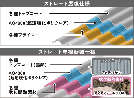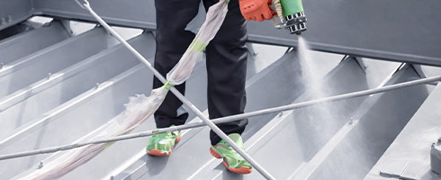 無溶剤タイプであるため環境負荷が少なく、周辺環境や人に優しい防水材です。特に、アスベストを含有する古い波形スレート屋根の改修時においても、粉じんの飛散を抑え、周囲への影響を懸念される現場でも安心してご依頼いただけます。