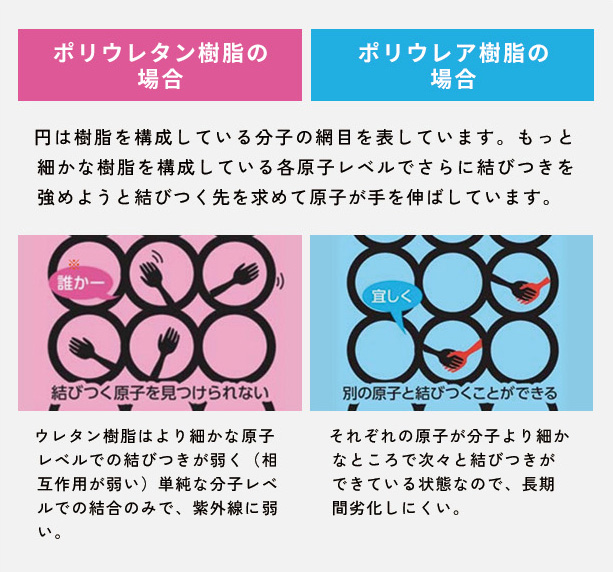 ウレタン樹脂と比較して、原子レベルでの結びつきが強く、長時間劣化しにくいという特長があります。「ポリウレタン」は手塗り施工が可能で安価ですが、硬化に時間がかかり、耐薬品性や耐候性の面では劣る傾向があります。これに対し「ポリウレア」は、専用のスプレー機を用いた吹付施工が必要ですが、そのぶん高性能かつ長寿命というメリットがあります。