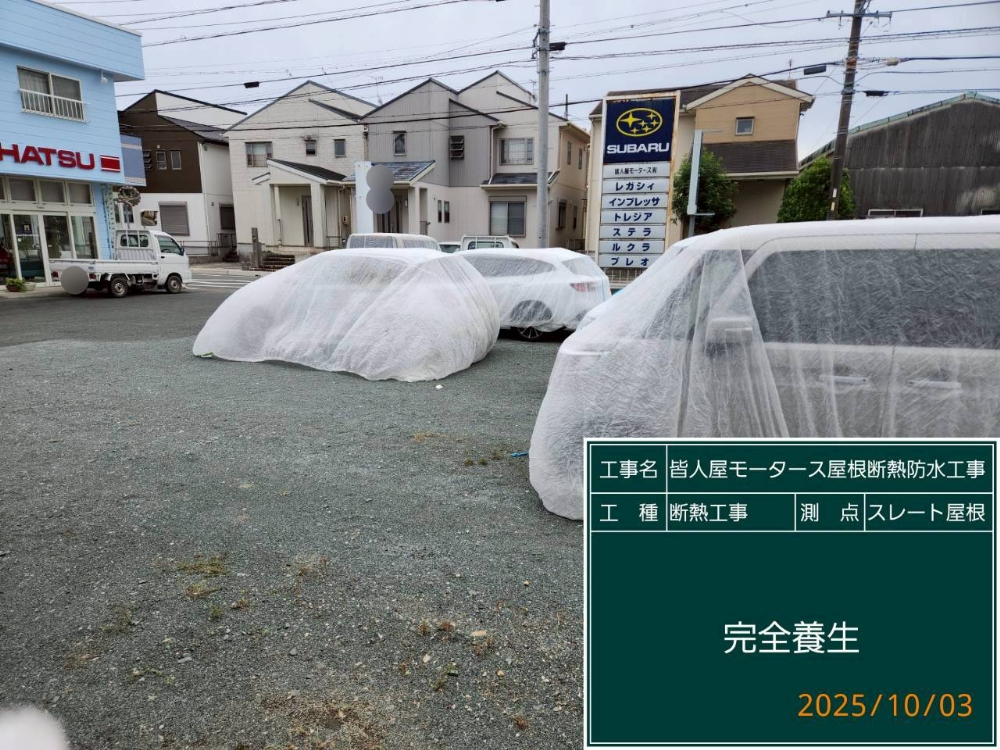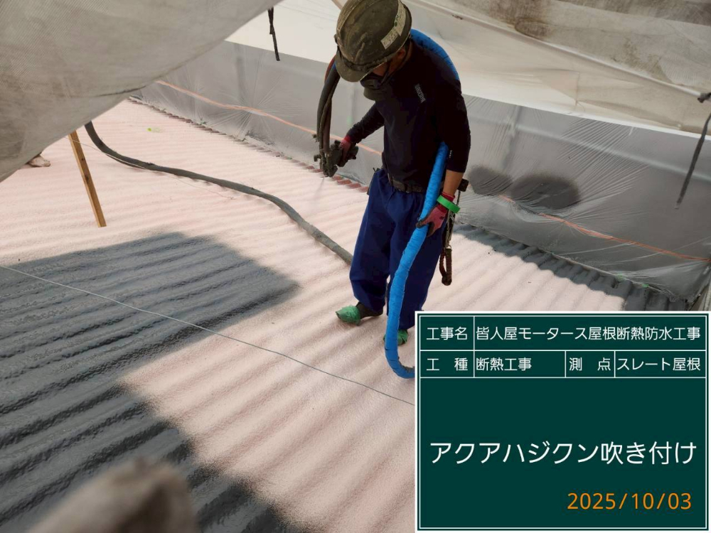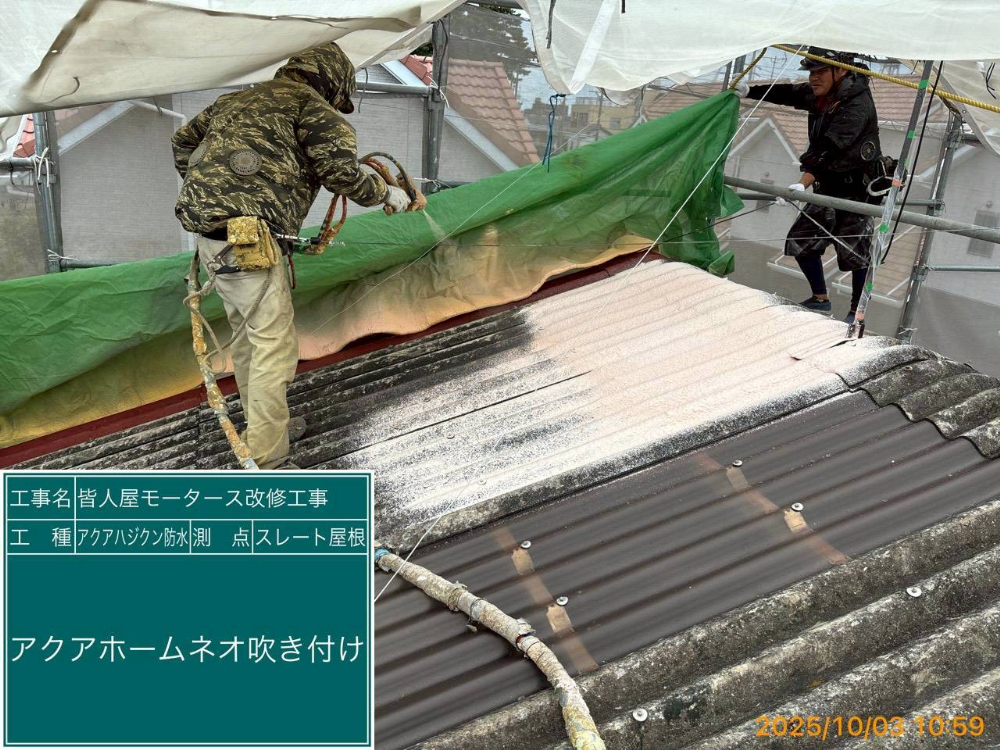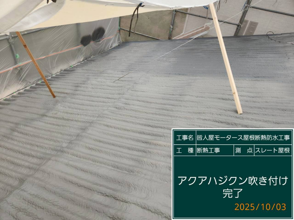 【豊橋市】皆人屋モータース様|スレート屋根改修工事|大波スレートの暑さ・雨漏りリスクを吹付防水で低減(アクアハジクン・アクアフォームNEO)