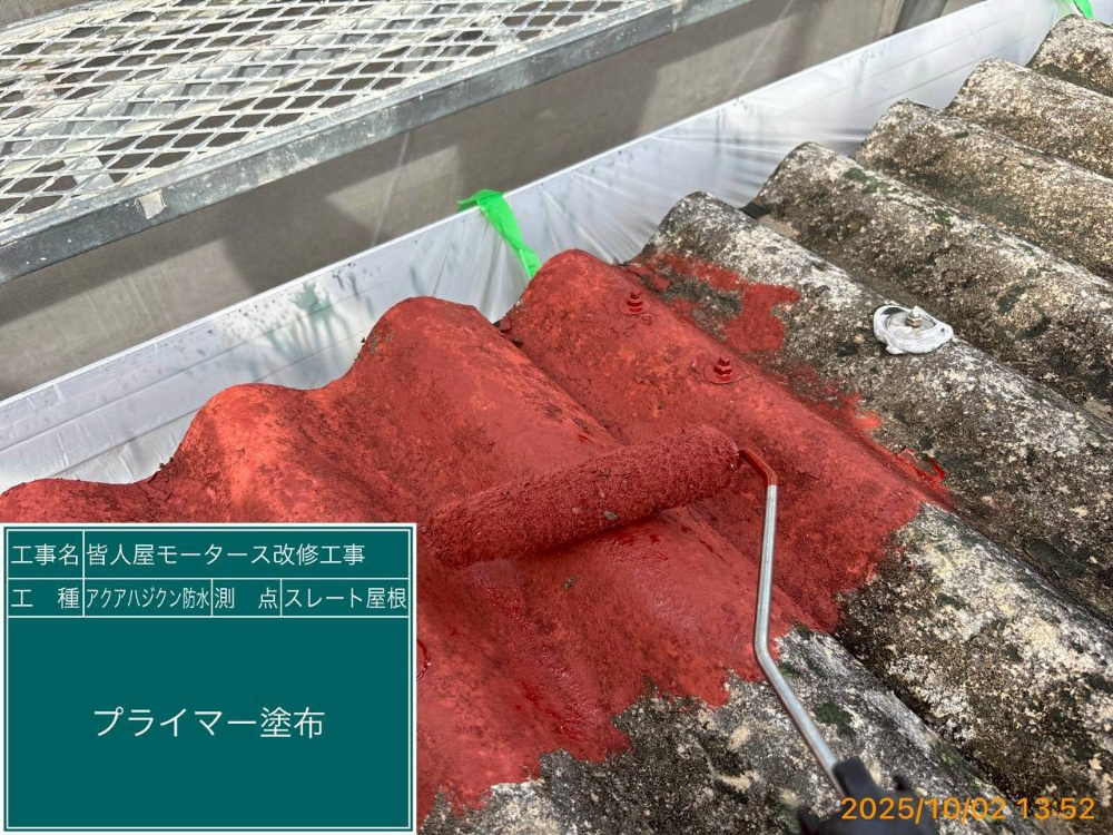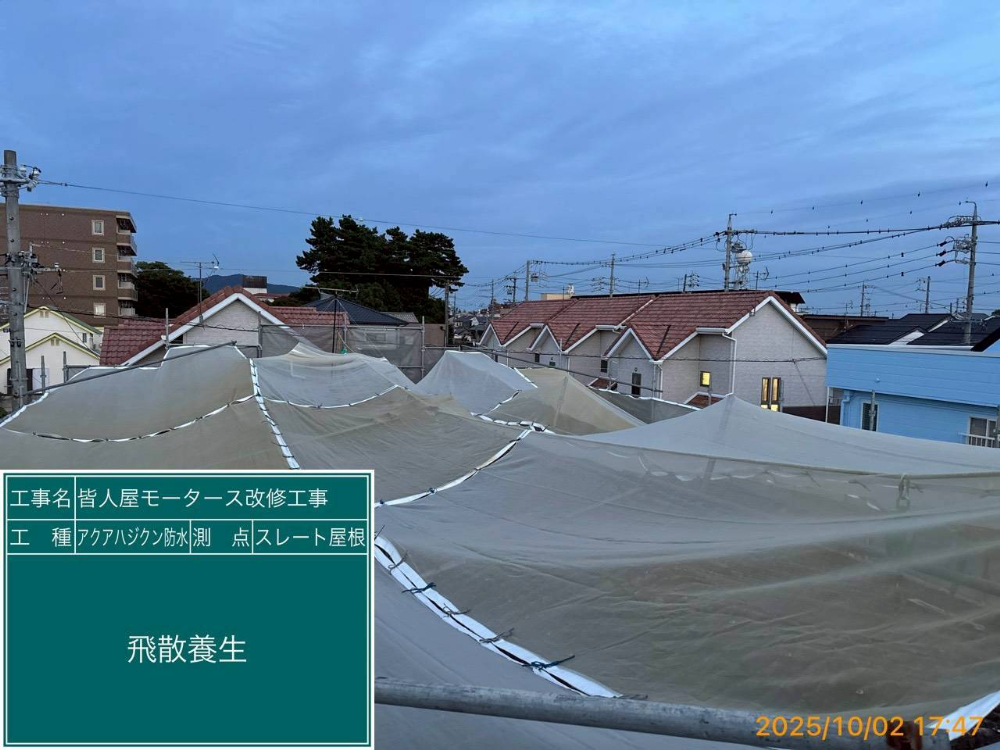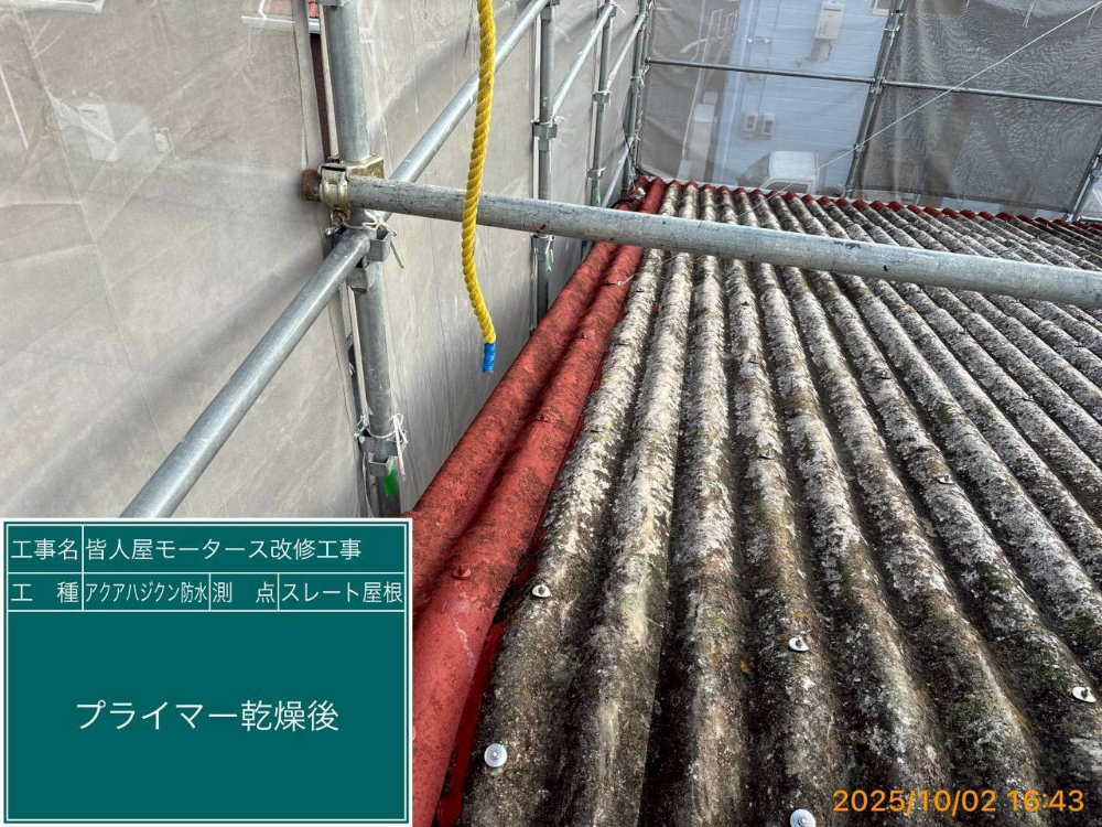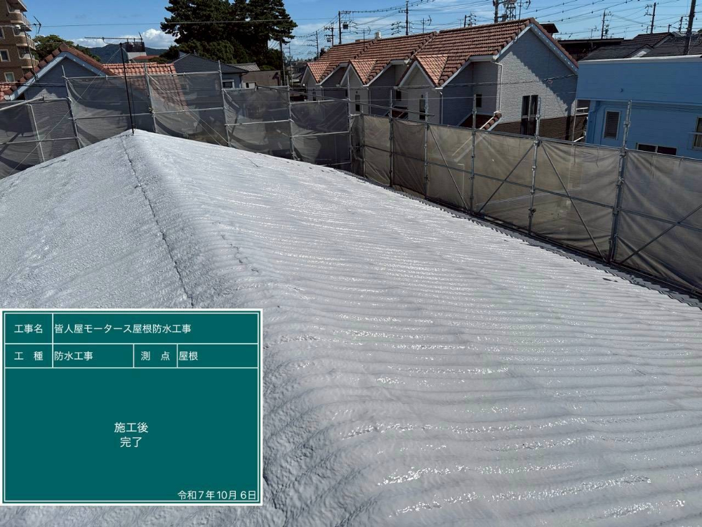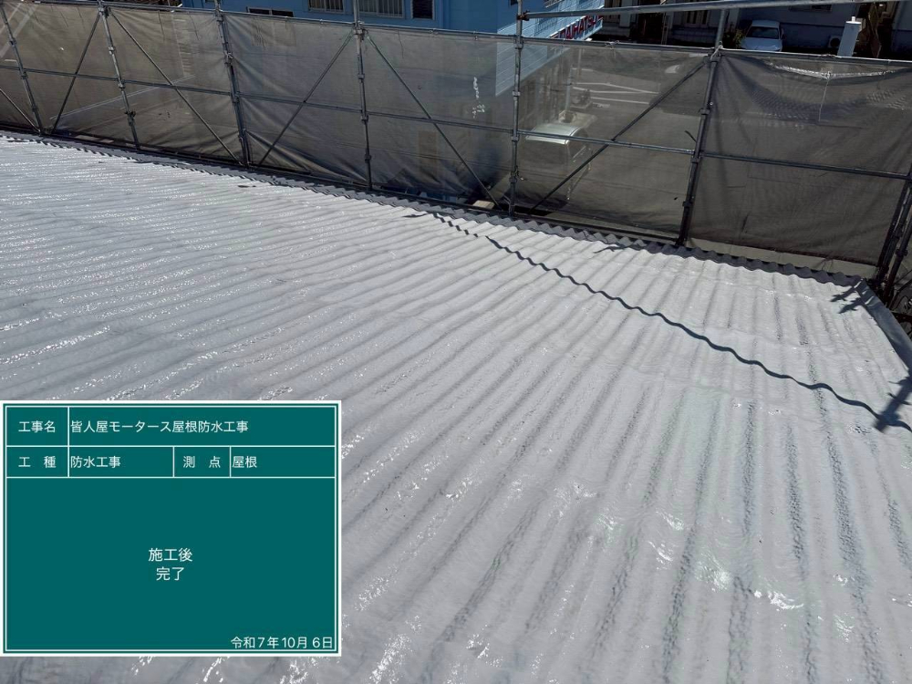 【豊橋市】皆人屋モータース様|スレート屋根改修工事|大波スレートの暑さ・雨漏りリスクを吹付防水で低減(アクアハジクン・アクアフォームNEO)