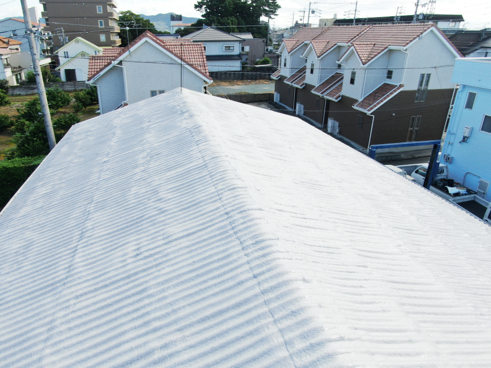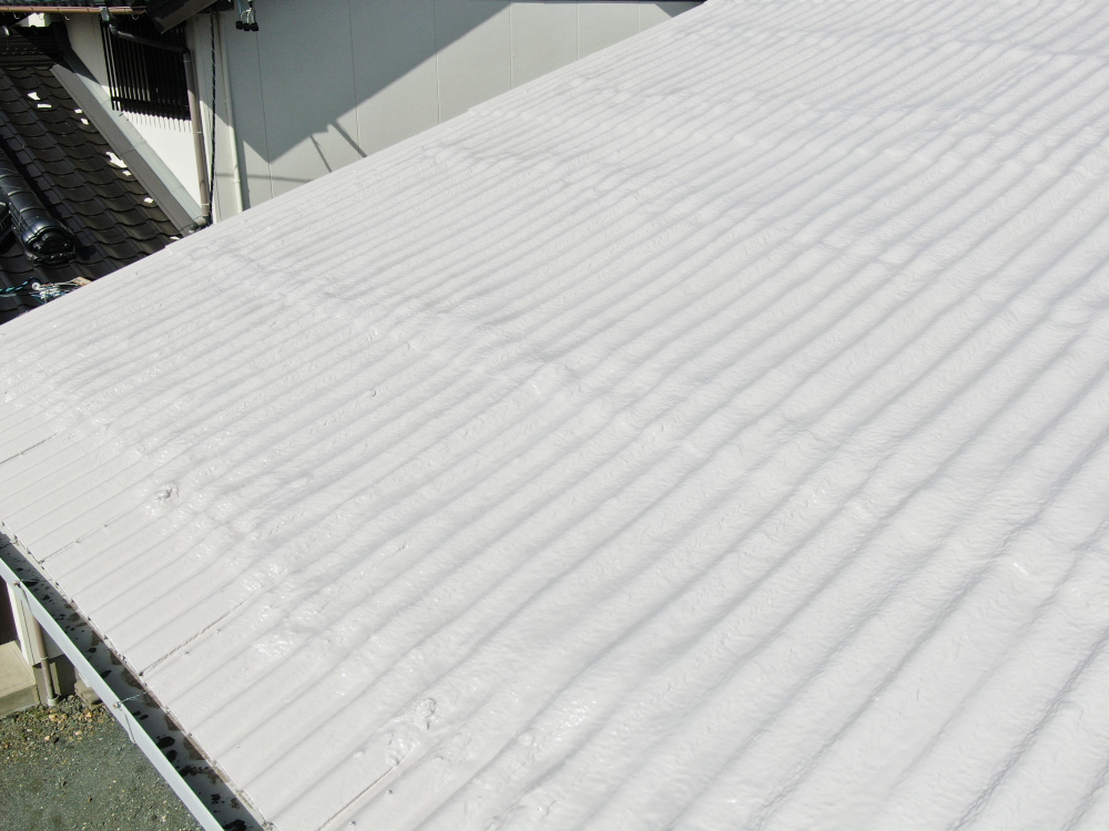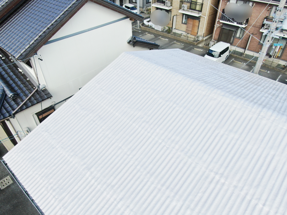 施工後の様子です。大波スレートの劣化と夏場の猛暑に悩まされていた屋根が、断熱材『アクアフォームNEO』と超速硬化防水材『アクアハジクン』の組み合わせによって、断熱・防水・補強を兼ね備えた屋根へと生まれ変わりました。